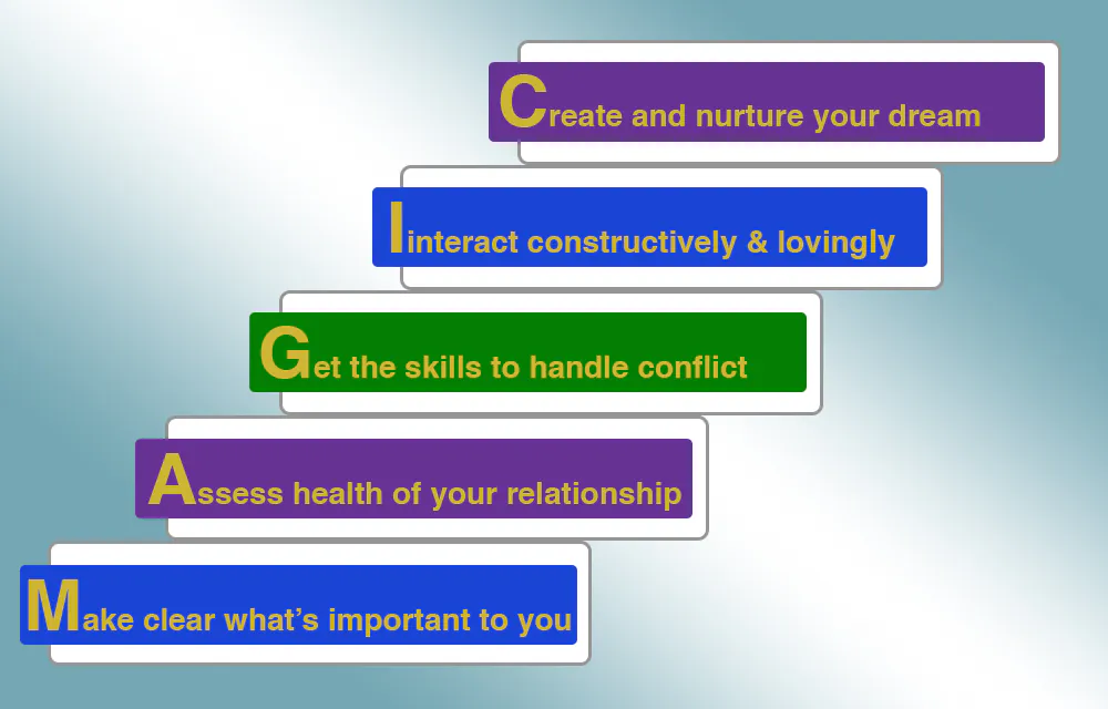Interact constructively & lovingly – Create Your Dream Marriage Together – You’ll converse effectively using the step by step Relationship Magic process to share insights from steps 1 and 2, while avoiding fighting or withdrawal by using the guidance from step 3.